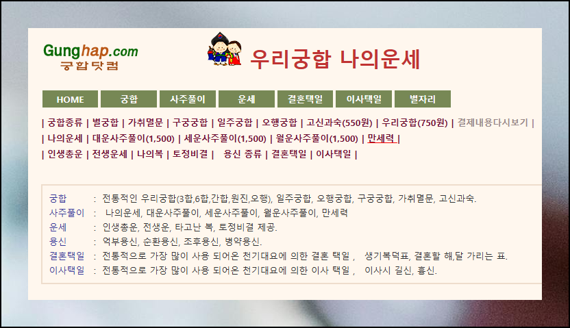 두 번째로 소개할 온라인 만세력 사이트는 '우리궁합 나의운세'입니다. 이곳에서는 결혼 택일도 비용 없이 볼 수 있어요. 대부분의 역술 서비스가 무상으로 제공되며, 메뉴 가장 오른쪽에서 "만세력"을 쉽게 찾아볼 수 있습니다.