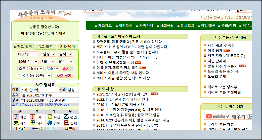 인터넷으로 무료 만세력을 확인할 수 있는 웹사이트 2곳을 소개해드립니다. 첫 번째는 사주팔자도우미 서비스인데요. 궁합부터 셀프 작명, 택일 만세력까지 다양한 서비스를 제공합니다.