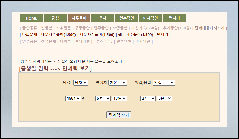 해당 인터넷 사이트에서 사주를 보는 방식은 첫 번째로 알려드린 서비스와 동일합니다. 콘텐츠 내용은 조금 더 간략하지만, 더 넓은 기간의 사주를 한번에 확인할 수 있는 장점이 있어요. 두 가지를 번갈아 이용하면 다양한 관점에서 만세력 정보를 해석할 수 있습니다.