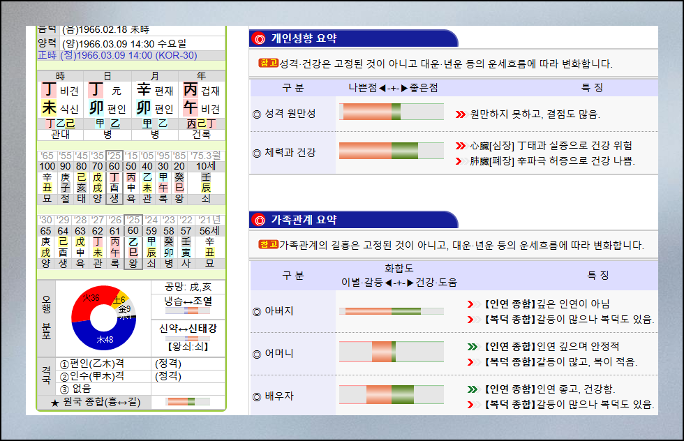 참고로 여기에 나와 있는 가족관계에 대한 내용 같이 길흉이나 화합도는 고정된 것이 아닙니다. 10년 주기 대운과 1년 주기 연운에 따라 변할 수 있어요. 그런 의미에서 현재의 가족관계 또한 변할 수 있다는 것을 참고하시길 바랍니다.