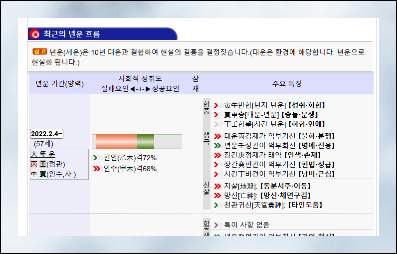 연운은 1년 주기로 길흉을 결정짓는 중요 요소입니다. 대운이 환경적 요소라면, 연운은 실현 방식을 나타냅니다. 삼재(三災) 정보도 인터넷 무료 만세력 서비스를 통해 알아볼 수 있으니 꼼꼼히 검토하세요. 연운을 통해 해당 년도의 주의점과 기회를 미리 파악하면 더 현명한 결정이 가능해집니다.