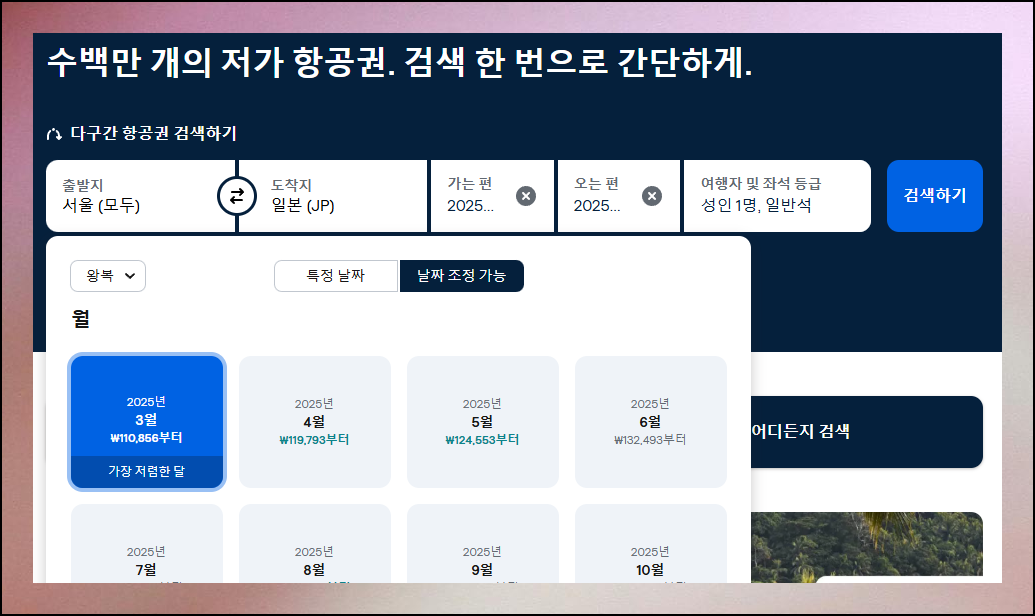 항공편 검색을 시작하려면 기본 데이터 입력이 필수입니다. 목적지는 일본으로, 출발지는 탑승할 공항을 정확히 선택하세요. 날짜의 경우에는 월 단위로 지정합니다.