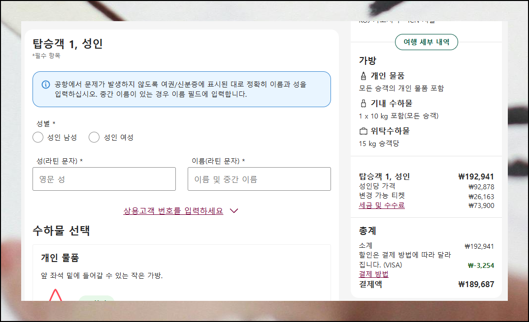 선택한 업체 페이지에서 여행 내용, 운임, 유류할증료, 공항시설사용료 등을 자세히 확인한 후 예약을 마무리하세요. 특히 이름과 날짜 정보가 정확한지 재확인하는 것이 필수입니다. 일본 비행기표를 구매할 때에는 안내에 따라 내용을 입력한 후, 요금 결재까지 진행하면 돼요.
