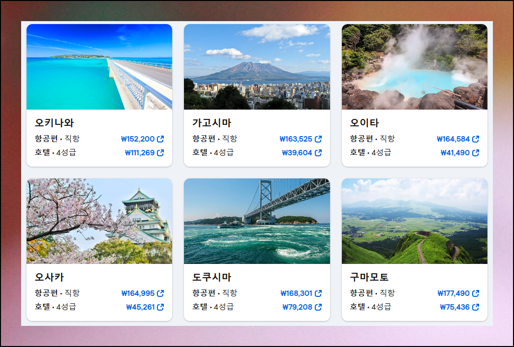 도착지를 일본 전체로 지정하면 지역별 가격을 한눈에 파악할 수 있습니다. 방문지를 아직 결정하지 않았거나 예산에 맞는 행선지를 찾고 있다면 특히 유용한 기능이에요. 일본의 다양한 도시 중 어느 곳이 가장 경제적인지 확인해보세요.