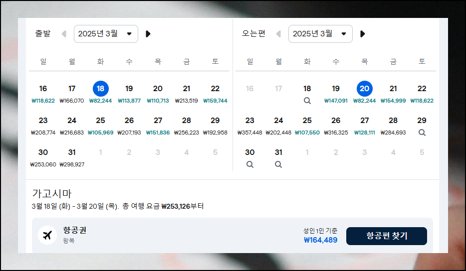 가장 저렴한 가고시마를 예시로 들면, 클릭 시 달력에 날짜별 최저가가 표시됩니다. 일정에 맞춰 가격이 낮은 날짜를 고르세요. 제가 찾아보니 가고시마는 왕복으로 비행기표가 164,489원이네요.