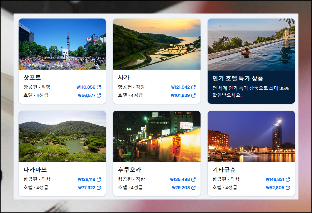 도착지를 일본 전체로 지정하면 지역별 가격을 한눈에 파악할 수 있습니다. 방문지를 아직 결정하지 않았거나 예산에 맞는 행선지를 찾고 있다면 특히 유용한 기능이에요. 일본의 다양한 도시 중 어느 곳이 가장 경제적인지 확인해보세요.