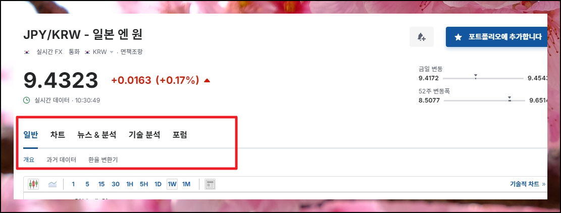 새롭게 열린 페이지를 통해 실시간으로 변하는 일본 환율조회 정보를 확인할 수 있어요. 메뉴 선택을 통해 뉴스, 차트, 기술 분석 등의 서비스를 이용할 수 있어요.