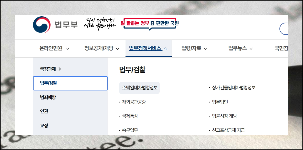 종합적인 정보 검색과 다양한 민원처리가 원스톱으로 가능한 플랫폼이네요. 무료양식을 받기 위해서는 먼저 법무정책서비스 메뉴로 이동하셔야 하는데, 이는 메인 페이지에서 쉽게 찾으실 수 있습니다.