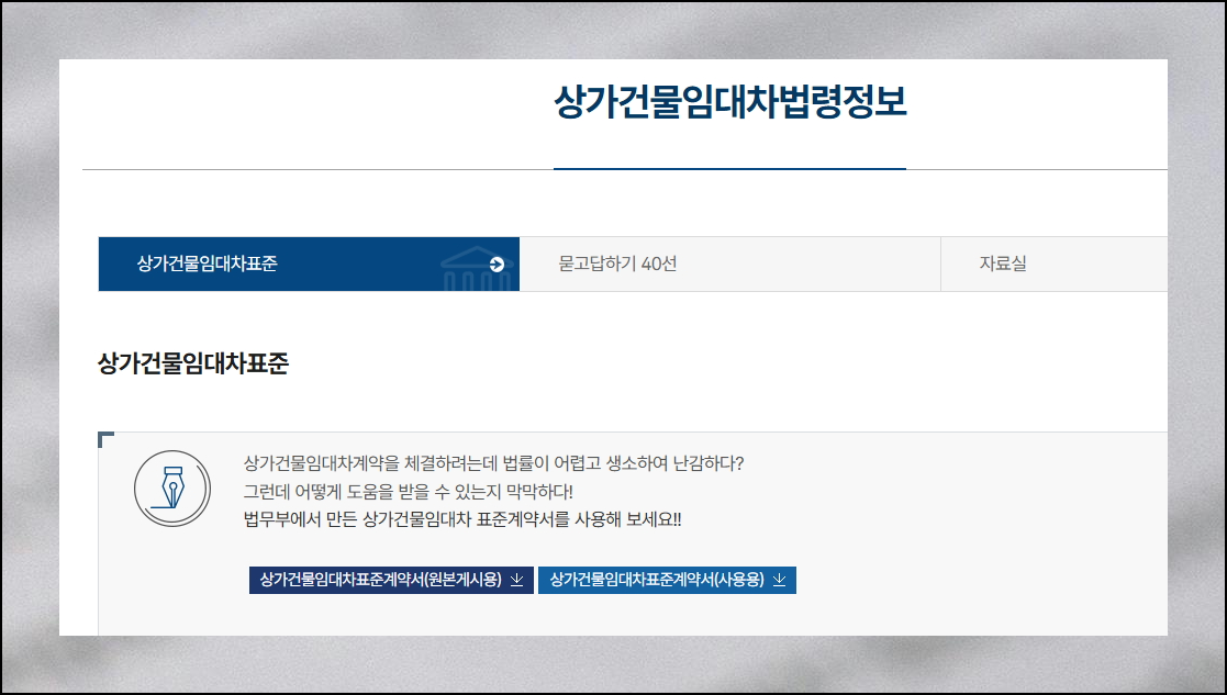 법무정책서비스에서 상가건물 임대차 관련 페이지로 자연스럽게 연결되는데요. 이곳에서는 두 가지 버전의 무료양식을 제공하고 있으며, 실제 사용을 위해서는 사용용 파일을 선택하시면 됩니다.