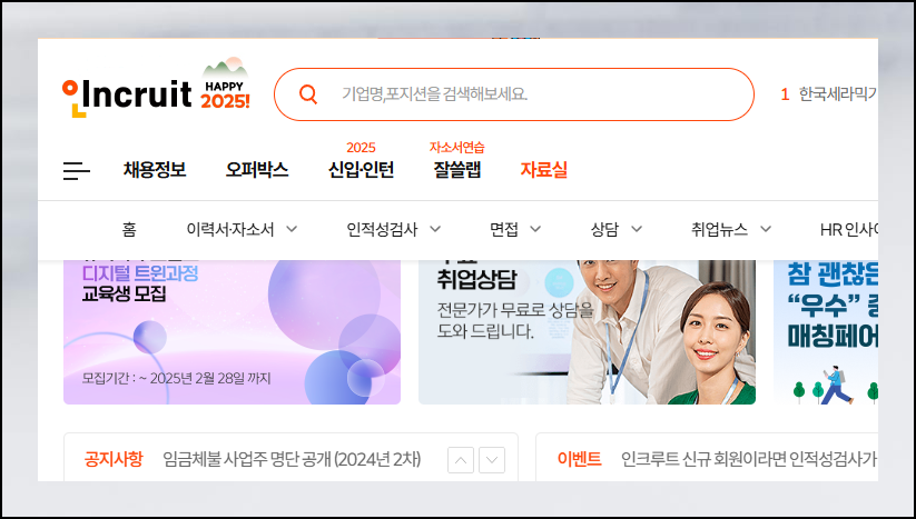 신입공채부터 알바콜, 인재검색, 연봉 정보까지 인크루트의 다양한 서비스를 살펴볼 수 있어요. 자기소개서 예시는 자료실 메뉴에서 확인 가능합니다. 글자수 세기와 맞춤법 검사 기능도 제공하니 문서 작성에 유용하게 활용해보세요.