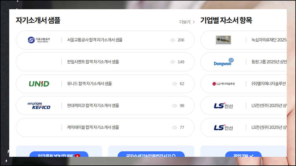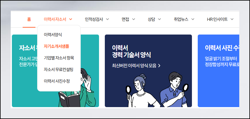 자료실에서는 취업뉴스, 이력서, 자기소개서 등 다양한 정보를 제공하고 있어요. 자료실 페이지에 있는 메뉴에서 자기소개서 샘플 메뉴를 선택하면 실제 합격한 사람들의 자소서 예시 모음에 접근할 수 있습니다.