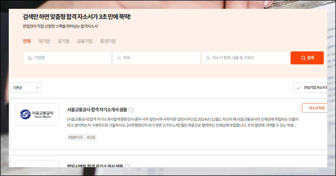 실제 합격한 선배들의 노하우가 담긴 수천개의 예시로 구성된 모음이 체계적으로 정리되어 있습니다. 게다가 성장과정, 입사 포부 등 항목별로 검색도 가능하니 원하는 내용을 쉽게 찾아볼 수 있죠.