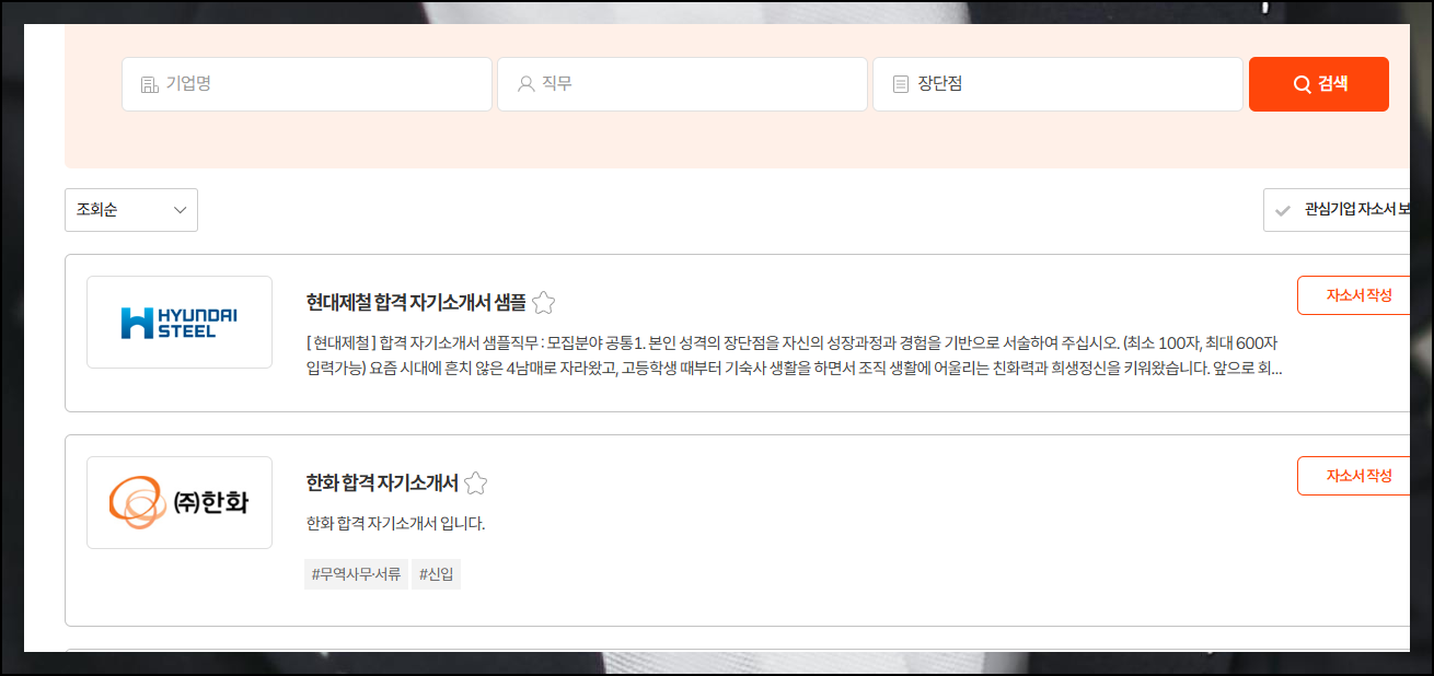 이곳에서는 수천 개의 자기소개서 예시가 무료로 공개되어 있어요. 현대제철, 국민연금공단, 한국전력공사 등 인기 기업의 합격 서류를 경력과 언어별로 구분해서 볼 수 있습니다. 각 제목과 내용이 잘 정리되어 있어 찾기도 쉽죠.