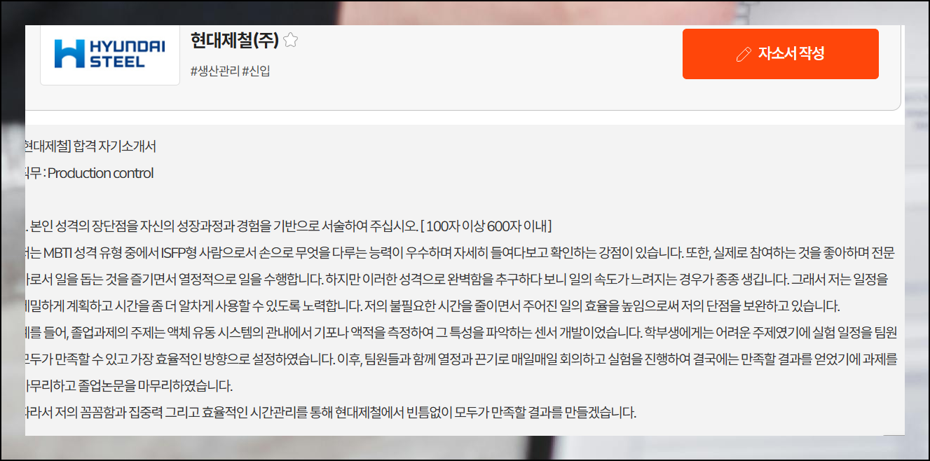 현대제철 합격자의 자기소개서를 보면 성격의 장단점, 성장과정 등 보편적인 질문들이 있어요. 보통 4개 항목으로 구성되며, 각 항목별로 100자에서 600자 정도의 제한이 있습니다. 내용 구성도 체계적이어서 참고하기 좋습니다.