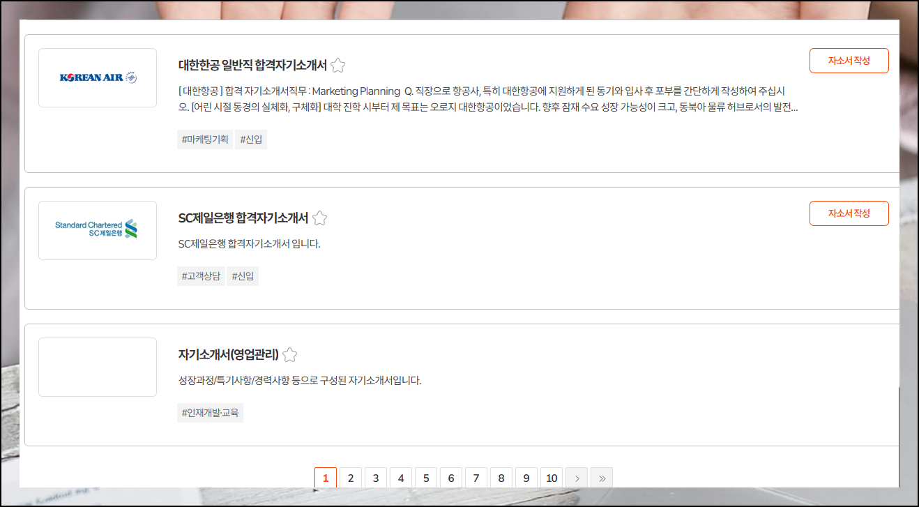 수천개나 되는 실제 합격 사례를 참고하면서 나만의 자기소개서를 작성해보세요. 풍부한 자료를 통해 더 나은 결과물을 만들 수 있을 겁니다. 물론 여기서 중요한 점은 자신의 이야기를 해야 한다는 것이에요. 합격자의 작성 방식은 참고만 하는 것이 좋습니다.