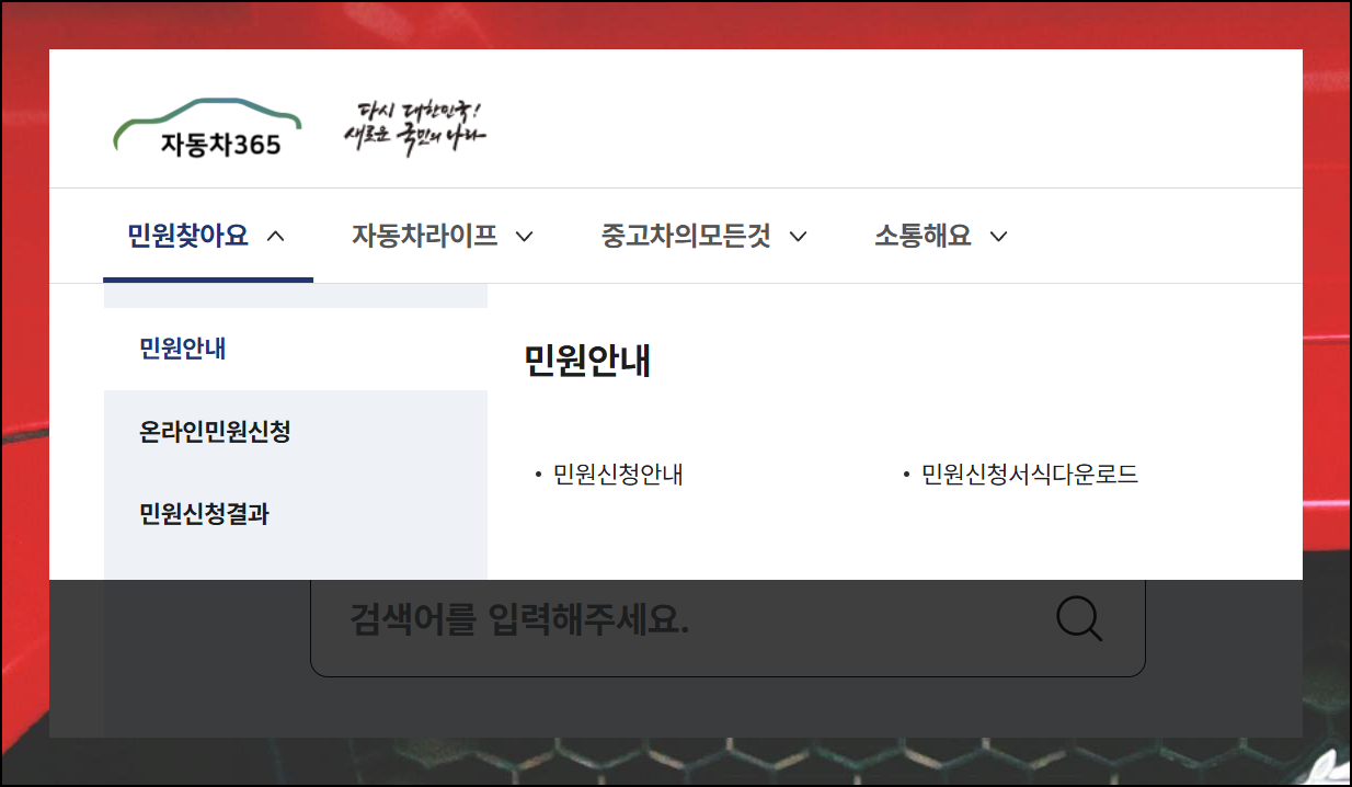 자동차민원 대국민포털 메인 화면에 도착하셨네요. 여기는 차량과 관련된 모든 민원을 한번에 처리할 수 있는 통합 서비스 공간이에요. 승용차를 사고팔 때도 반드시 이 사이트를 거쳐서 정식 절차를 밟아야 합니다. 매매계약서 양식을 찾는 방법을 단계별로 안내해드릴게요. 화면 위쪽에 있는 "민원 찾아요"라는 메뉴를 먼저 눌러주세요. 그러면 두 개의 하위 항목이 나타날 거예요.