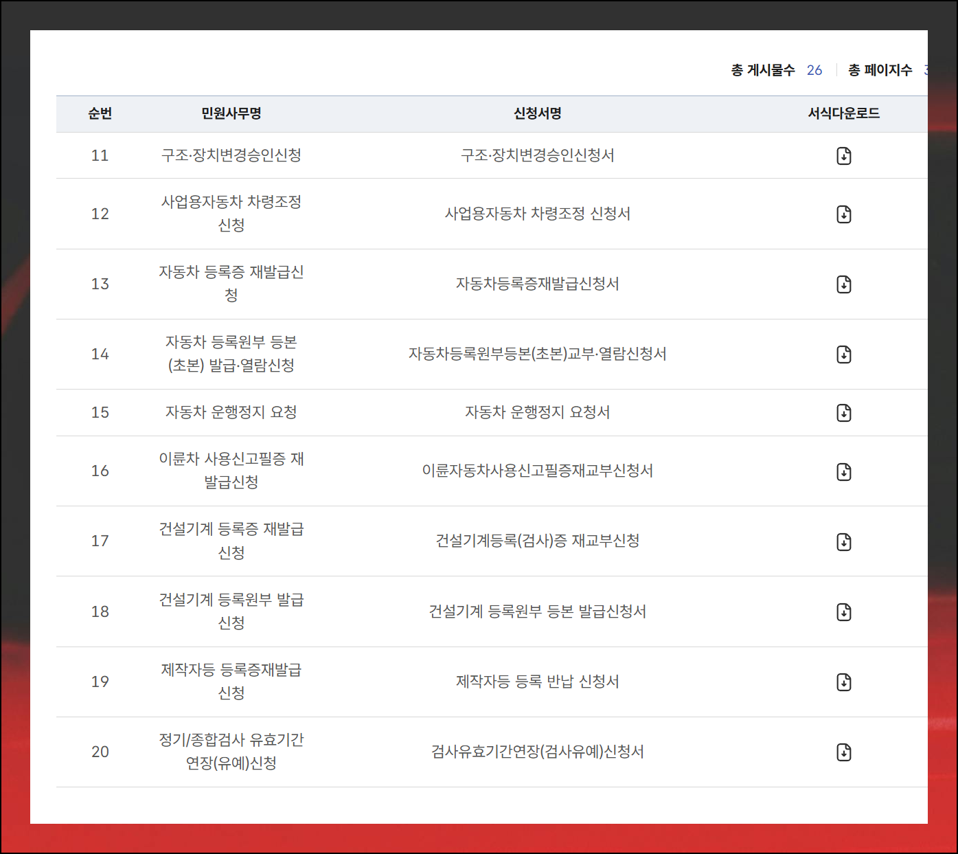 새로운 페이지가 열리면서 각종 양식을 무료로 받을 수 있는 디지털 자료실이 나타나요. 앞서 언급한 자동차 매매계약서 양식 무료 다운로드는 물론이고, 다른 유용한 문서들도 이곳에서 찾아볼 수 있습니다. 각종 재발급 신청서와 이전 등록 신청서, 임시로 운행할 수 있는 허가 신청서 등을 언제든 찾아서 저장할 수 있어요. "서식 다운로드"라는 버튼을 클릭하면 HWP 확장자로 된 파일이 컴퓨터에 저장됩니다. 이 파일을 보려면 한글 워드프로세서가 설치되어 있어야 하니 참고해 주세요.