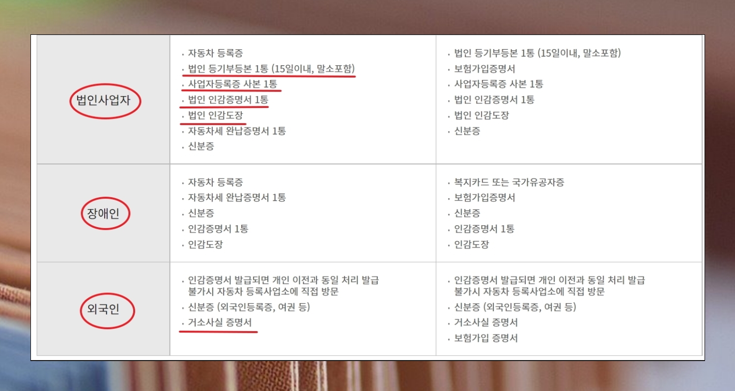 법인사업자, 장애인, 외국인의 경우에 이에 따른 필요한 자료가 있는데요. 장애인의 경우 차량을 거래할 때 복지카드 또는 국가유공자증을 지참하셔야 합니다. 외국인의 경우 거소사실 증명서가 필요하고요.