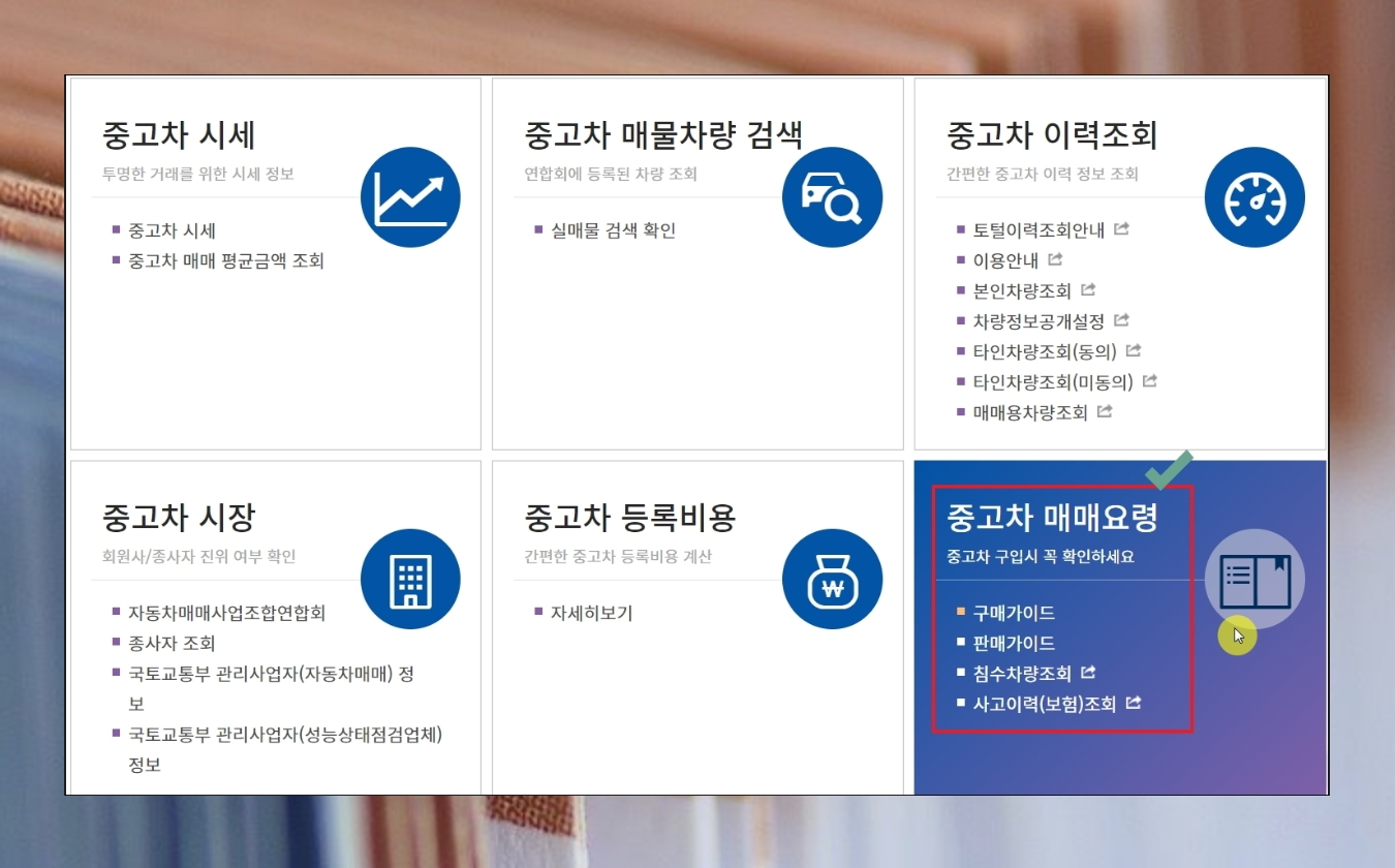 중고차 시세, 매물차량 검색, 이력조회를 알아볼 수 있고, 중고차 시장이나 등록비용에 대해 살펴보는 것도 가능합니다. 중고차 매매시 요령도 있는데요. 구매 및 판매가이드나 각종 조회가 가능합니다. 중고 차동차 매매시 꼭 확인해보는 것이 좋습니다.