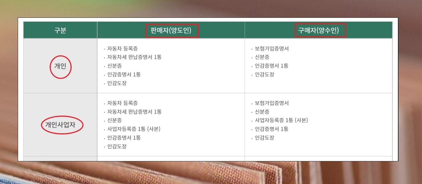 필요한 서류는 거래 주체에 따라 달라집니다. 판매하는 사람과 구매하는 사람 그리고 개인, 개인사업자, 법인사업자, 장애인, 외국인에 따라 필요한 서류가 다른데요. 기본적으로는 판매자의 경우 자동차 등록증, 세금 완납증명서, 신분증, 인감증명서, 인감도장이 필요합니다. 사업자인 경우 사업자 등록증이 필요하죠.