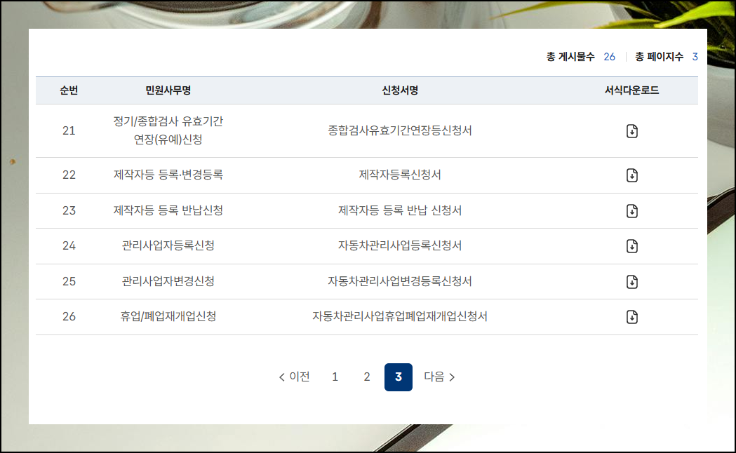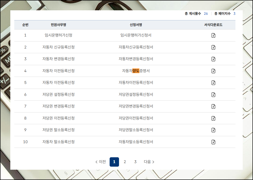 민원안내 메뉴의 민원신청서 다운로드 코너를 클릭해보시면 됩니다. 양도증명서 양식뿐만 아니라 차량과 관련된 다양한 신청서를 한 장소에서 받아보실 수 있어요. 등록 변경이나 임시 번호판, 신차 등록 등 필요한 모든 서류가 준비되어 있습니다. 무료 파일을 통해 미리 받아두시면 언제든 활용하실 수 있어요.