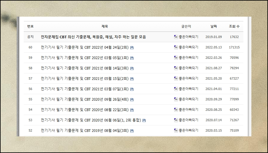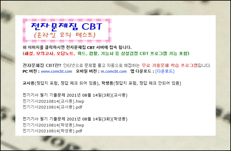 여러 가지 자격시험 준비를 위한 무료 기출문제를 구할 수 있는 곳이 있어요. comcbt 사이트를 검색하시면 다양한 자격증 관련 문제들을 찾아보실 수 있습니다. 이곳에서 전기기사 자격을 위한 기출문제를 얻으실 수 있죠. 특히 전기기사 준비의 기본이 되는 자료이므로 꼭 풀어보시길 바랍니다.