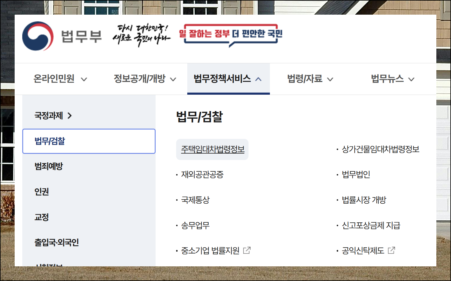 사이트에서 제공하는 다양한 서비스 중에서 "법무정책서비스"를 먼저 클릭하고, 이어서 법무검찰 메뉴로 이동하시면 됩니다. 해당 카테고리를 보면 우리가 찾는 자료를 찾을 수 있습니다. 이렇게 양식 다운로드를 위한 경로는 매우 직관적이에요.