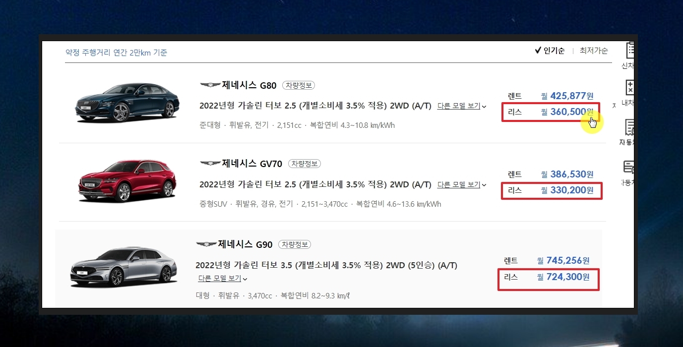 제네시스 g80 리스 가격표 조회 및 신청 방법