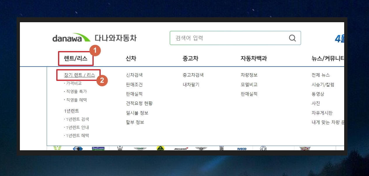 다나와 자동차 홈페이지에 접속하면 [렌트 / 리스] 메뉴를 클릭합니다. 참고로 이곳에서는 제네시스 신차, 중고차, 렌트 가격표에 대해서도 알아볼 수 있습니다. 판매실적이나 시승기 및 칼럼, 여러 차량 사진도 볼 수 있죠.