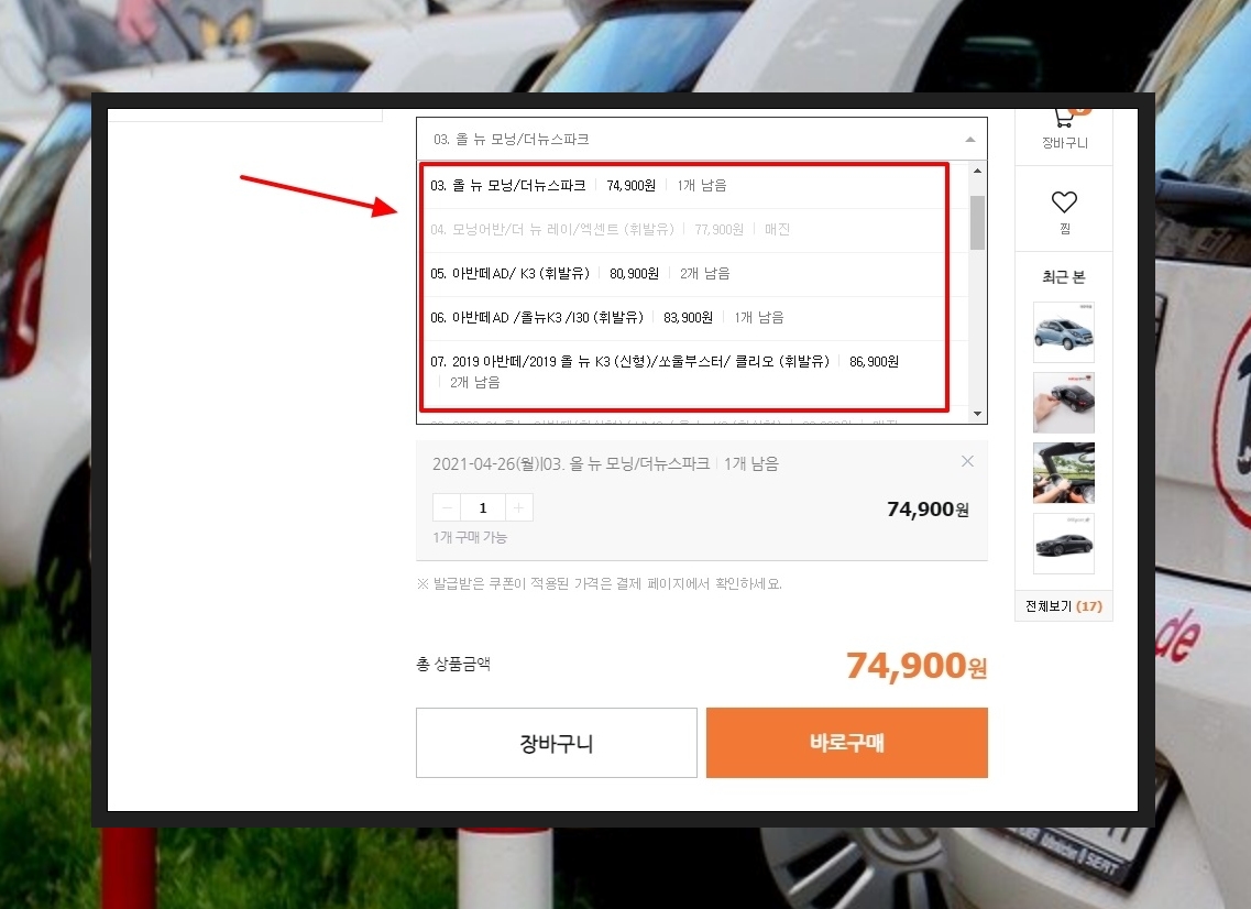 날짜 선택 후 차량 모델을 선택합니다. 보통 모닝과 스파크와 같은 경차가 가장 저렴하고, 그 다음으로는 아반떼와 k3가 저렴합니다. 모델명 옆에 제주도 렌트카 이용 금액과 이용할 수 있는 차량 대수가 표기되어 있습니다. 모델을 선택한 후 "바로구매" 버튼을 누르면 예약까지 진행이 가능합니다.