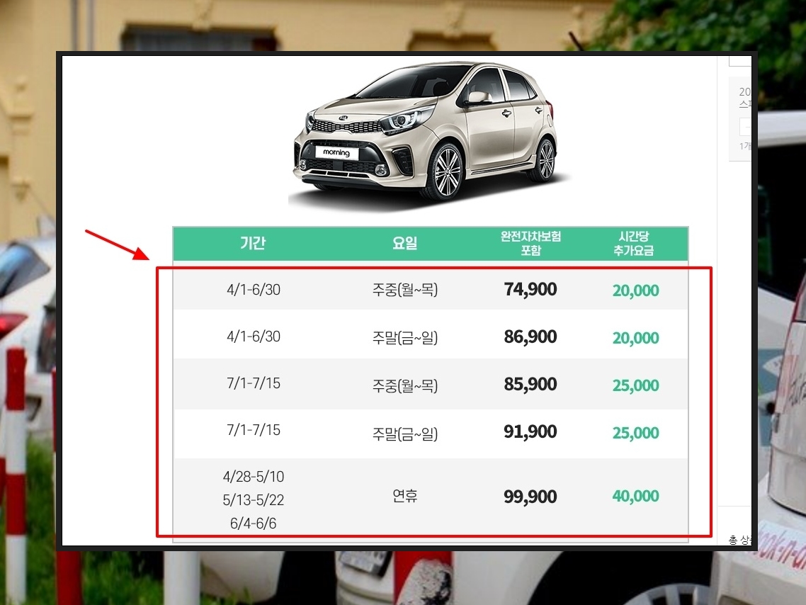 저처럼 해외 여행 가기를 꺼리는 분의 경우에는 제주도를 많이 찾습니다. 특히 성수기의 경우에는 이곳의 렌트카 가격도 올라가기 마련인데요. 성수기든 비성수기든 간에 해당 가격비교 사이트를 통해 가장 저렴한 곳을 찾을 수 있습니다. 요즘 시세를 기준으로 볼 때 모닝을 렌트하는 비용이 이 정도 되네요. 제주도 렌트카 가격비교 사이트에서 좀 더 찾아보면 조금 더 저렴한 업체를 찾을 수 있을 겁니다.