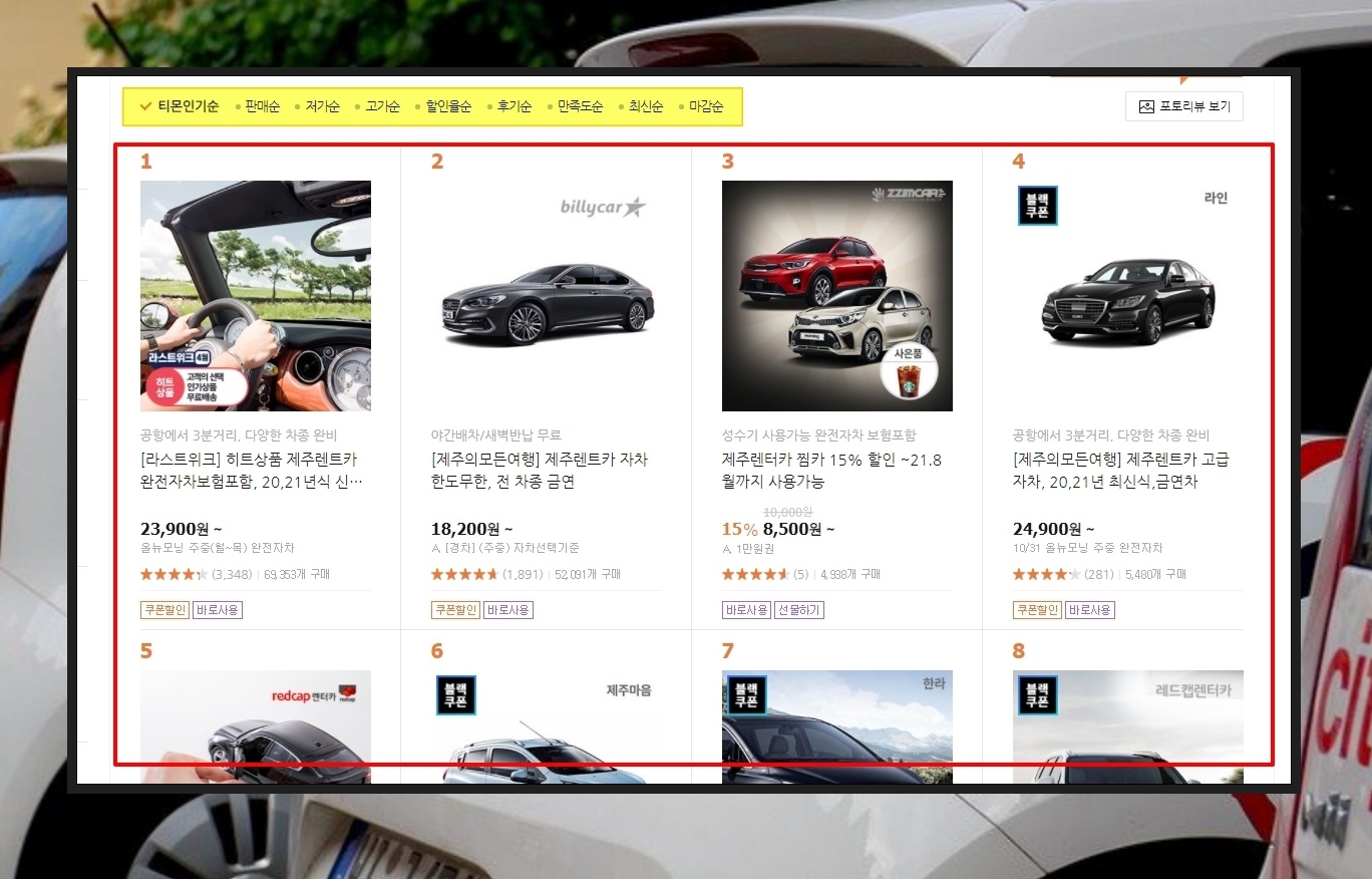 개인적으로 저는 티몬 사이트를 많이 이용합니다. 왜냐하면 다른 곳에 비해 찾아볼 수 있는 제주도 렌트카 상품의 수가 많기 때문입니다. 얼마나 많은지 해당 사이트에 접속하여 알아보겠습니다.