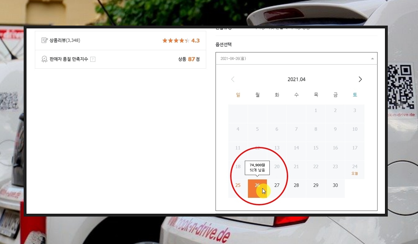 가격 정책이 위와 같다고 하여도 이용할 수 있는 차량이 없다면 아무 소용이 없습니다. 상품을 선택한 후 상세페이지에서 옵션으로 들어가 날짜를 선택해 봅니다. 그럼 달력을 통해 이용할 수 있는 날짜가 나타납니다. 날짜 위에 마우스 커서를 올려보면 최저가 차량의 금액과 이용할 수 있는 차량의 수가 나타납니다.