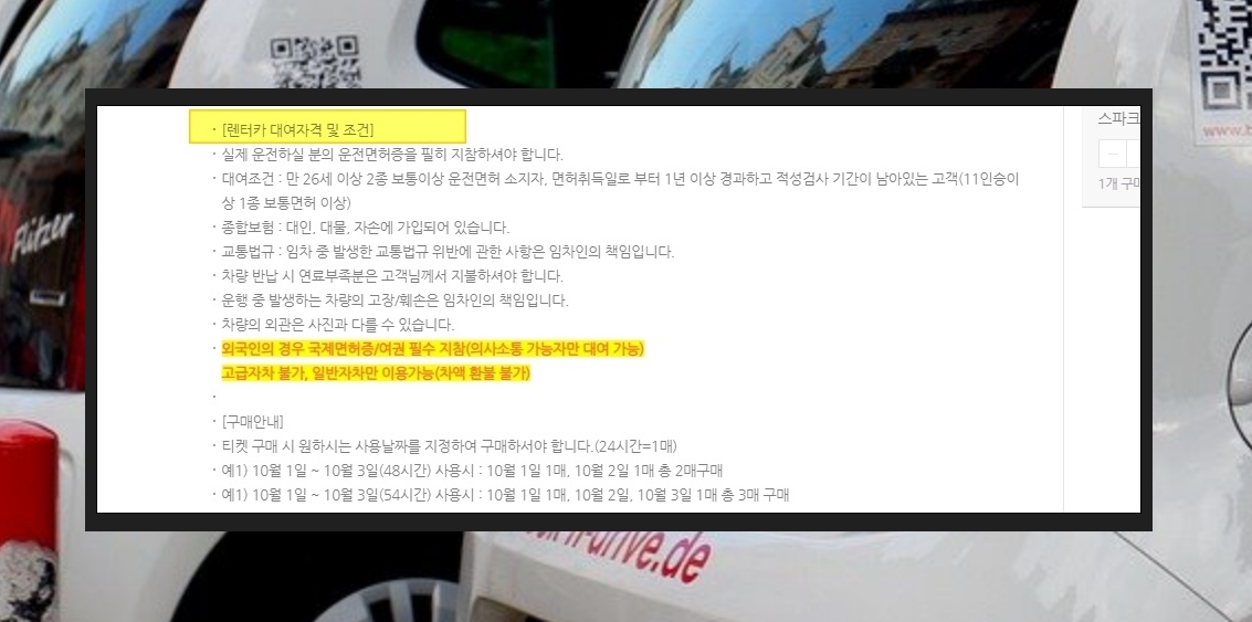 렌터카를 이용할 때에는 대여자격이나 조건이 충족되는지 꼭 확인해야 합니다. 예약을 했음에도 불구하고, 나이, 경력 등의 조건이 맞지 않아 이용할 수 없게 되는 일이 발생할 수 있기 때문입니다.