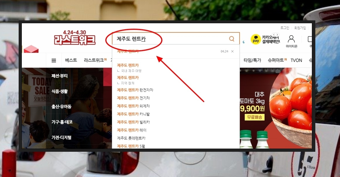 티몬에 접속하면 화면 상단에 있는 검색 창에 "제주도 렌트카"를 입력한 후 엔터키를 눌러주세요.