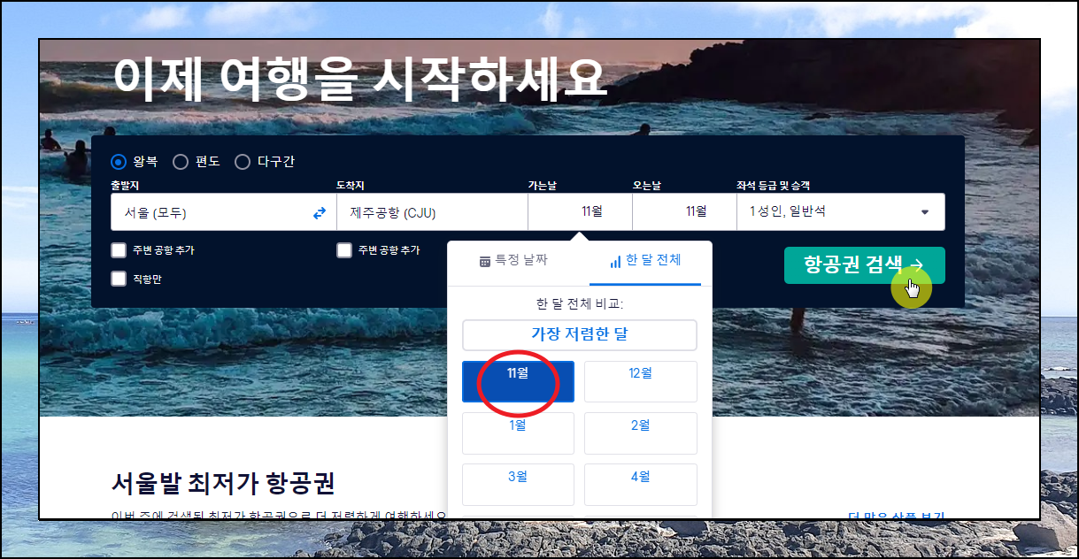 스카이스캐너 사용법은 굉장히 간단합니다. 로그인을 하지 않아도 저렴하게 나온 항공권을 찾거나 예약까지 진행이 가능하죠. 일단 본인이 찾고자 하는 항공권을 검색해야 하는데요. 출발지는 비행기 탑승을 할 공항, 도착지는 제주도 공항, 가는날과 오는날 등을 정확하게 적으면 됩니다. 날짜 지정을 할 때에는 제주도 티켓이 저렴한 날짜를 이용하고 싶다면 [한 달 전체] 단위를 사용하는 것이 좋습니다. 필수 항목을 채웠다면 [항공권 검색] 버튼을 클릭해주세요.