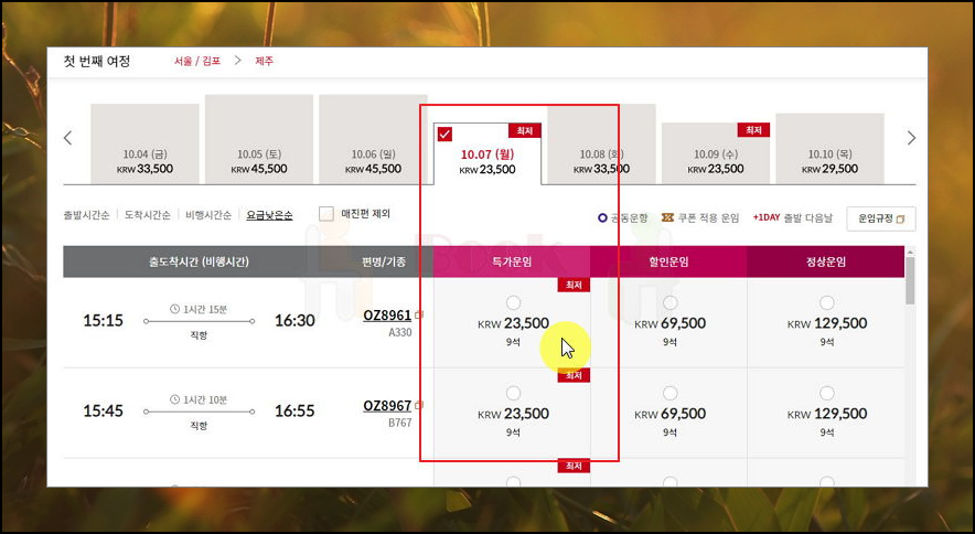 8. 특가 운임의 혜택을 누려보세요. 출발할 때의 항공권을 아시아나 항공 사이트에서 예약을 해야 하네요. 김포에서 제주로 가는 땡처리항공권인데요. 특가운임으로 23,500원에 예약을 할 수 있었습니다. 일반적으로 많이 예매하는 정상운임(129,500원)에 비해 엄청나게 저렴하다는 것을 알 수 있어요.
