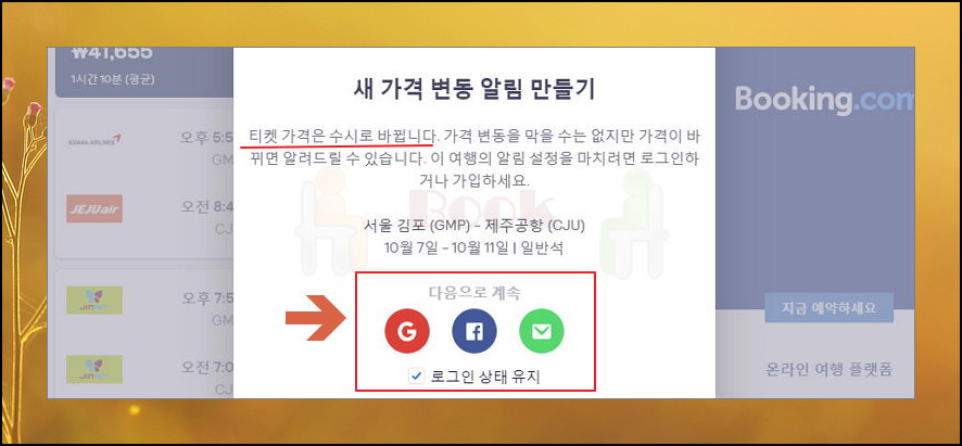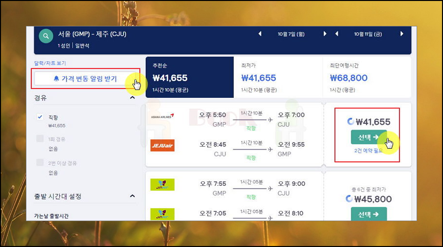 5. 알림 서비스로 특가를 놓치지 마세요. 제가 알려드린 방식대로 찾은 제주 항공권의 가격이 마음에 들지 않을 수 있습니다. 그런 경우에는 가격 변동 알림 받기 서비스를 이용해 보세요. 출발 날짜가 가까워질수록 땡처리항공권이 생깁니다. 이에 대한 알림을 설정하게 되면 더 낮은 가격의 땡처리 상품을 쉽게 찾을 수 있어요.
