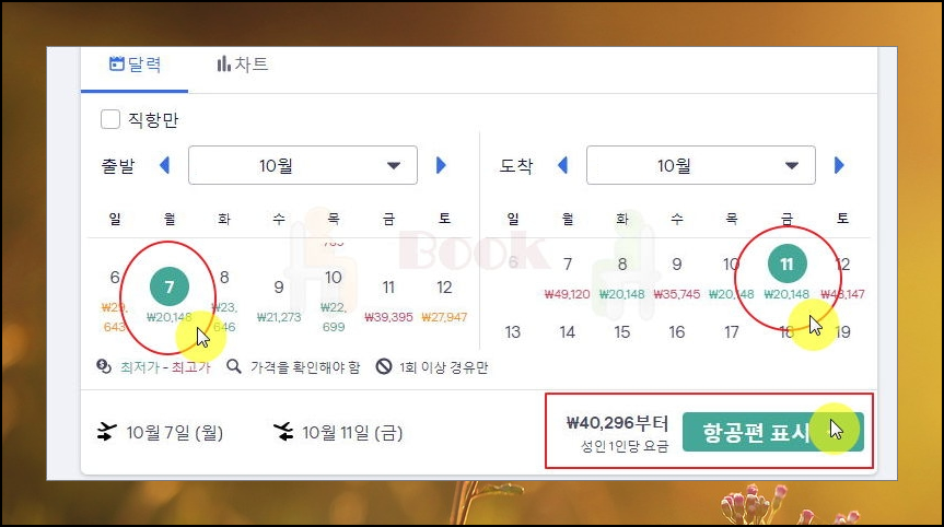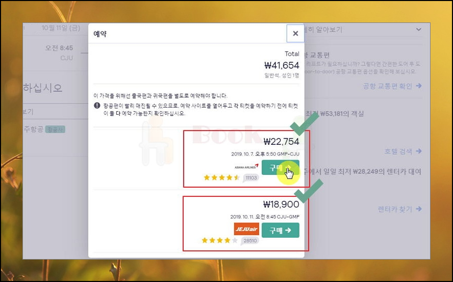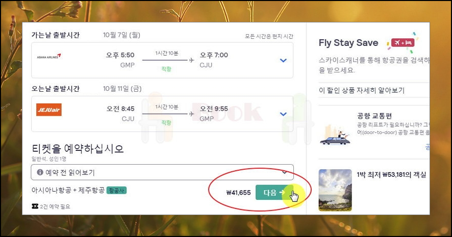 6. 예약 진행 시 주의할 점이 있어요. 가격이 마음에 드는 경우에는 예약을 진행하실 수 있는데요. 항공편을 선택하면 티켓을 예약할 수 있는 사이트가 나타납니다. 마음에 드는 업체를 선택해 주세요. 참고로 제주로 출발하는 날짜와 시간, 돌아오는 날짜와 시간을 꼼꼼히 확인하시길 바랍니다.
