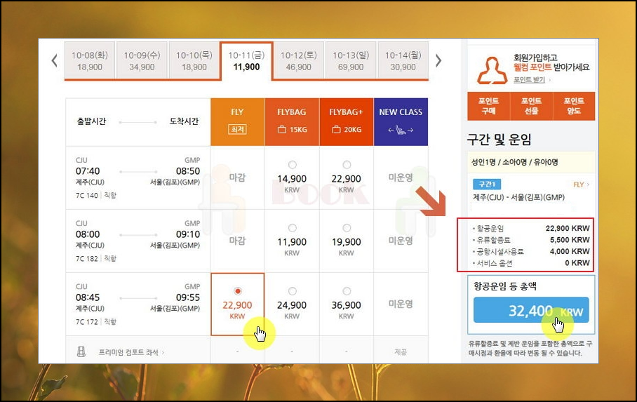 10. 총 금액과 포인트를 체크하세요. 이번에는 제주항공에서 돌아올 때의 비행기표를 예약하려고 하는데요. 유류할증료, 공항시설사용료가 포함된 가격이오니 결제를 할 때 총 금액을 꼼꼼히 확인해보시길 바랍니다. 이곳에서 운영하는 사이트에 회원가입을 하는 경우 웰컴 포인트도 받을 수 있다고 하니 참고해 주세요.