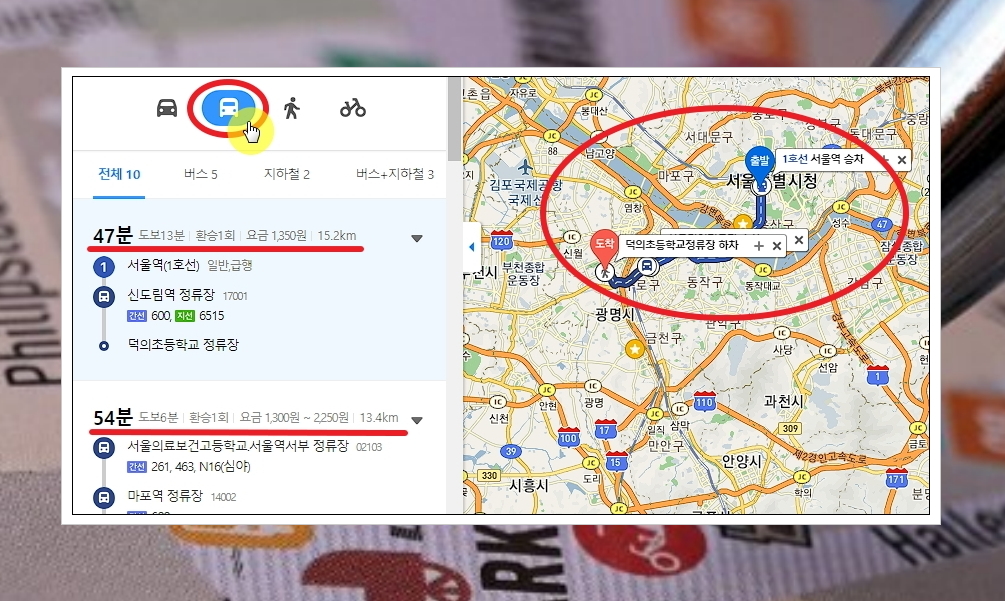 길 찾기 서비스에서 대중교통 아이콘을 클릭해 보세요. 그럼 버스 또는 지하철을 이용하여 해당 위치나 주소로 가고자 할 때 어떤 방법을 이용하는 것이 좋은지 알려줍니다. 버스 번호, 지하철 노선에 대한 정보와 정거장 그리고 대중교통 요금도 알 수 있습니다.
