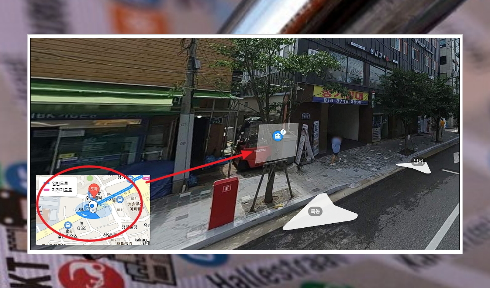 이런 식으로 360도 돌아가는 사진을 통해 주소로 찾은 위치의 풍경을 살펴볼 수 있습니다. 처음 방문을 하는 곳이라면 길을 잃지 않기 위해 로드뷰 기능을 활용하면 좋아요.