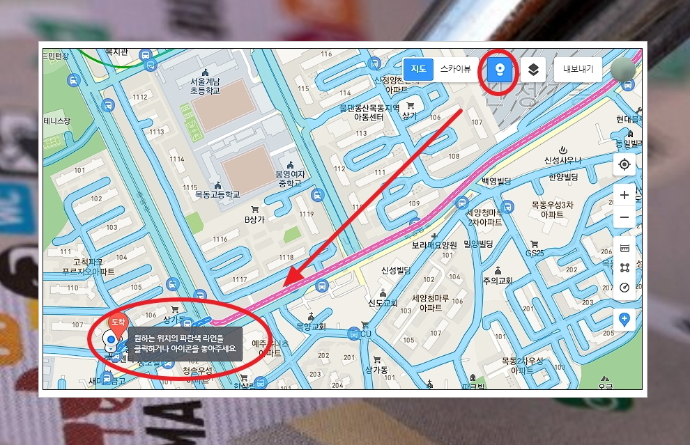 카카오맵을 이용하는 경우 로드뷰 서비스를 이용해 보세요. 그럼 해당 위치의 주변 풍경을 컴퓨터로 보는 것이 가능해요.