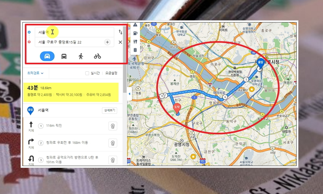 이번에는 주소로 찾은 위치로 가고 싶을 때 유용한 길 찾기 서비스를 사용하는 법을 알려드리겠습니다. 이전 단계에서 지도 화면에 있는 [길 찾기] 버튼을 클릭하면 바로 사용이 가능한데요. 출발지를 "서울역"으로 지정해 보겠습니다. 그럼 자가용을 이용할 때 어떤 루트를 통해 가면 되는지 확인할 수 있습니다. 통행료, 주유비, 거리 확인은 물론이고, 택시를 이용하는 경우에는 택시비 산정도 해줍니다.