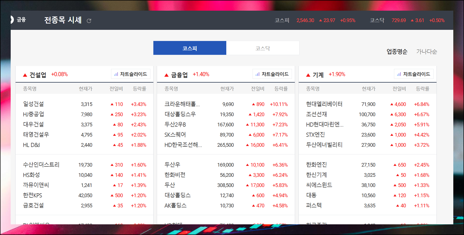 매매 경험이 있으신 분들은 같은 업종의 주식들이 비슷한 가격 흐름을 보인다는 사실을 아실 거예요. 업종명순 버튼을 클릭하면 건설업, 금융업, 기계업 등 산업별로 종목을 그룹화하여 볼 수 있습니다. 이렇게 업종별로 시세를 조회하면 현재 어떤 산업 분야가 호황을 누리고 있는지 쉽게 파악할 수 있어요.