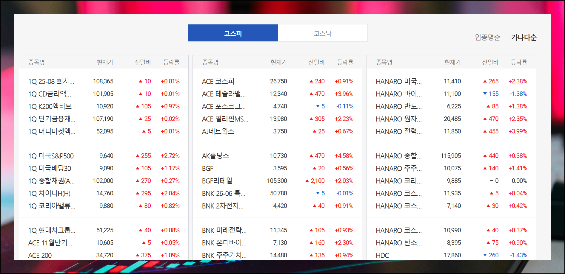 다양한 종목의 시세를 동시에 비교할 수 있는 표 형식의 페이지가 제공됩니다. 이 표에서는 현재가, 전일비, 등락률 등 핵심 정보를 한눈에 볼 수 있어요. 코스피와 코스닥에 상장된 모든 주식이 정리되어 있으며, 가나다순으로 정렬하면 찾고자 하는 특정 종목을 더욱 빠르게 찾을 수 있습니다.