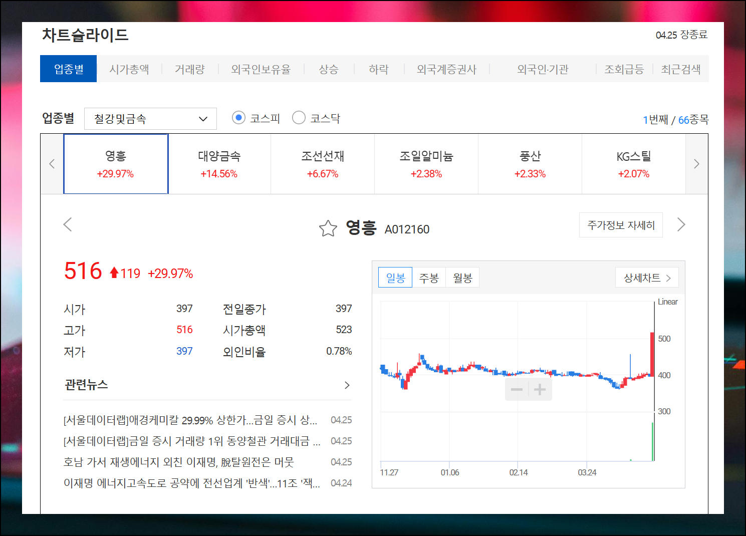 차트슬라이드 버튼을 통해 선택한 업종의 모든 주식을 실시간으로 분석할 수 있습니다. 이 기능은 일정 시간 간격으로 종목이 자동으로 전환되면서 다양한 지표, 그래프, 관련 뉴스를 보여줘요. 이를 통해 여러 종목의 정보를 효율적으로 수집하고 분석할 수 있습니다.