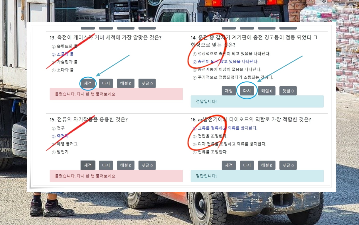 4. 각 문항의 질문을 꼼꼼히 읽어보고, 답이라고 생각이 되는 선택지를 마우스로 클릭합니다. 정답 확인을 하고 싶다면 각 문항 아래에 있는 [채점] 버튼을 누르면 되고, 다시 풀어보고 싶다면 [다시] 버튼을 누르면 됩니다. 참고로 실제 지게차운전기능사 필기시험에서는 60문항을 60분 안에 풀어야 합니다. 이점을 감안하여 최소한 1분 안에 1문제를 풀 수 있도록 연습하는 것이 좋습니다.