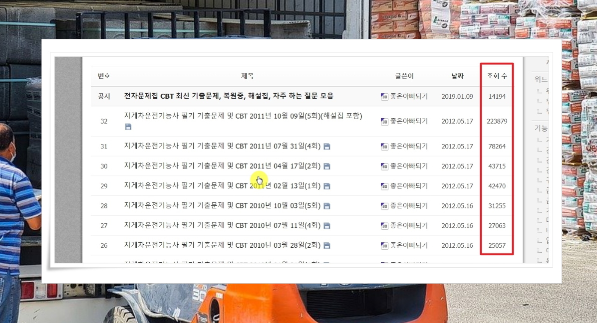 7. 지게차운전기능사 전용 게시판이 열리면 필기 기출문제 자료를 다운 받고 싶은 회차를 선택해 주세요. 각 게시물의 조회수를 보면 몇 만명이나 될 정도로 많은 사람들이 이용했음을 알 수 있습니다.