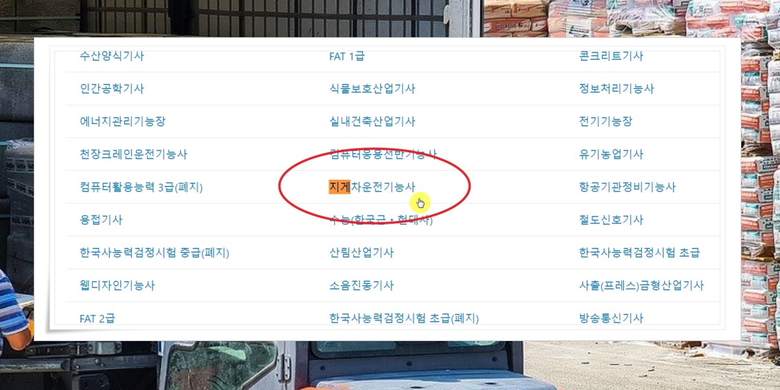 6. 여러 가지 자격증의 기출문제를 다루는 곳이기 때문에 꽤 많은 이름의 자격증 목록이 나타납니다. 여기에서 지게차운전기능사를 찾아 클릭해 주세요.